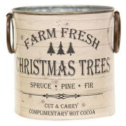 The 2/Set, Farm Fresh Christmas Trees Buckets sell as a set of two galvanized metal buckets with a Christmas theme. Each has a distressed white background that displays, "Farm Fresh Christmas Trees | Spruce • Pine • Fir | Cut & Carry | Complimentary Hot Cocoa." The design is accented by the silhouettes of three pine trees in the middle of the phrasing. Each bucket includes a pair of round metal handles. Smaller bucket measures 6.25" high by 6" in diameter. Larger bucket is 7.25" high by 7.25" in diameter.