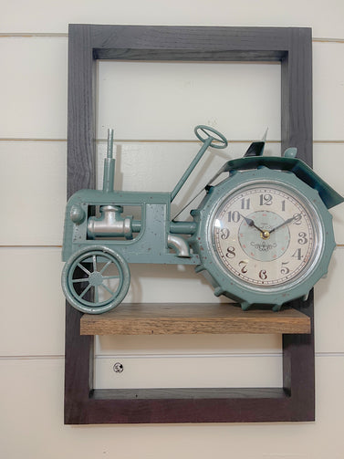Farmhouse Blue Tractor Clock is made of metal and shaped like an old-fashioned tractor. It is painted light blue and peppered with a rusty, scratched-metal look. The clock face is set in the back wheel and protected by a hard, clear plastic cover. It runs on one AA battery (not included), and sits well on a shelf or table in the living room, kitchen, or a bedroom. Measures 11" high by 16" wide by 2" deep.