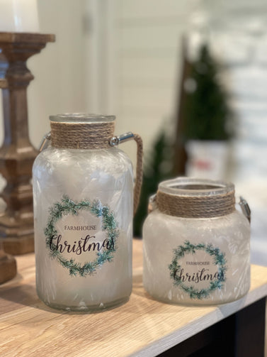 Wide Farmhouse Christmas Jar is a frosted glass jar that features a wreath of greenery and the phrase, "Farmhouse Christmas." The top of the jar is wrapped with jute cord that is threaded through with a split ring and a jute rope handle. Measures 4¾" high by 5" wide with a 5" handle.